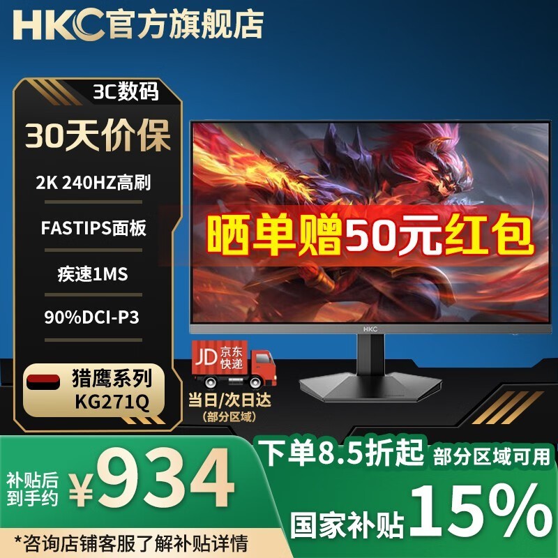 HKC 27英寸2K电竞显示器KG271Q,京东补贴后低至934元