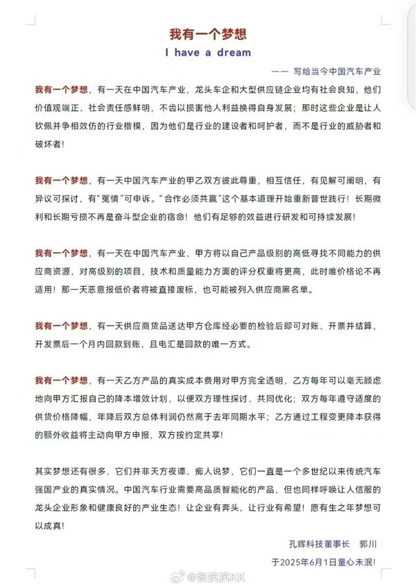 快科技6月1日消息,针对当前国内车企间的内卷和价格战现状,孔辉科技董事长郭川发文《我有一个梦想》,文中透露了他对汽车供应链和车企今后健康发展的期许之情。