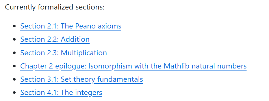 《Analysis I》共有 11 个章节,目前已被形式化的章节如下: