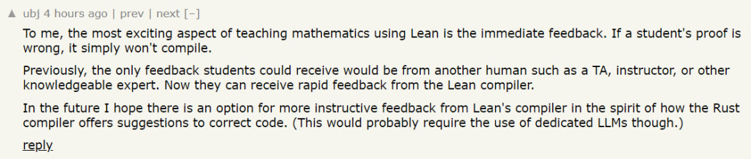 还有人分享了使用 Lean 来教数学的体会,最令人兴奋的地方是即时反馈。如果学生的证明错了,则根本无法通过编译。以前,学生只可以从助教、老师或其他知识渊博的专家那里获得反馈,而现在能够通过 Lean 编译器快速得到反馈。