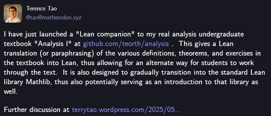 博客地址:https://terrytao.wordpress.com/2025/05/31/a-lean-companion-to-analysis-i/
