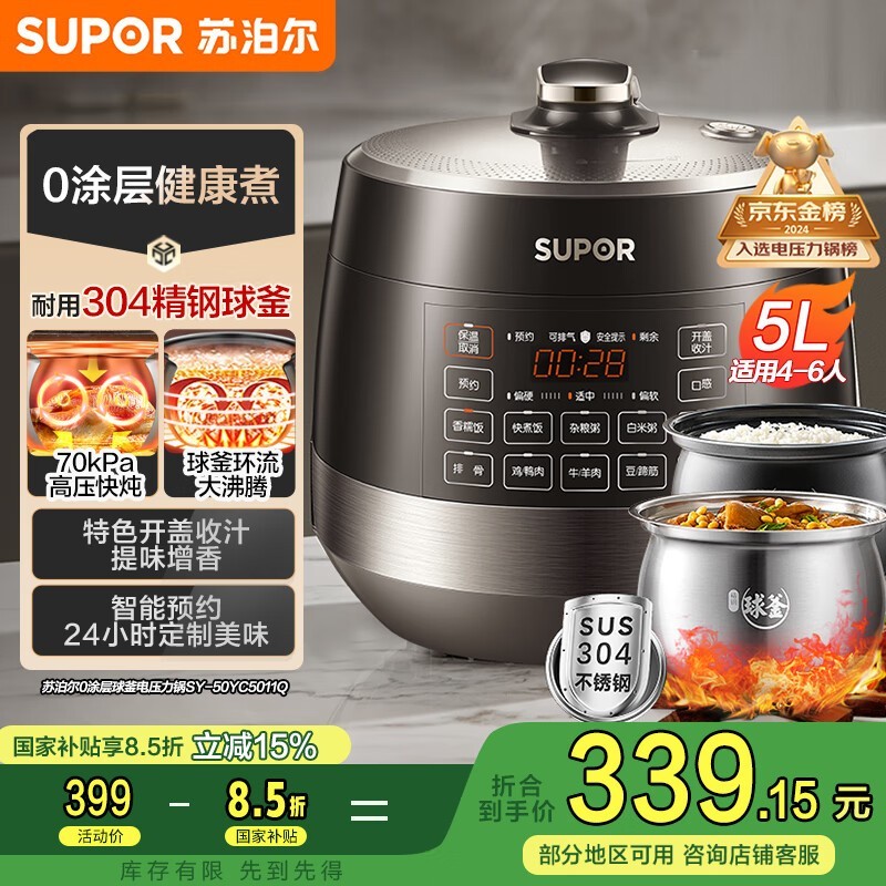 苏泊尔5L精钢球釜电压力锅双胆家用触控智能菜单一键烹饪省心