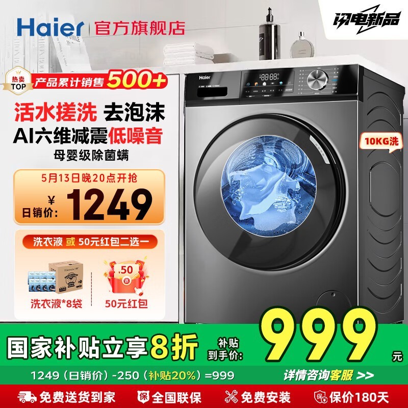 海尔10kg玉墨银滚筒洗衣机京东特惠1287元