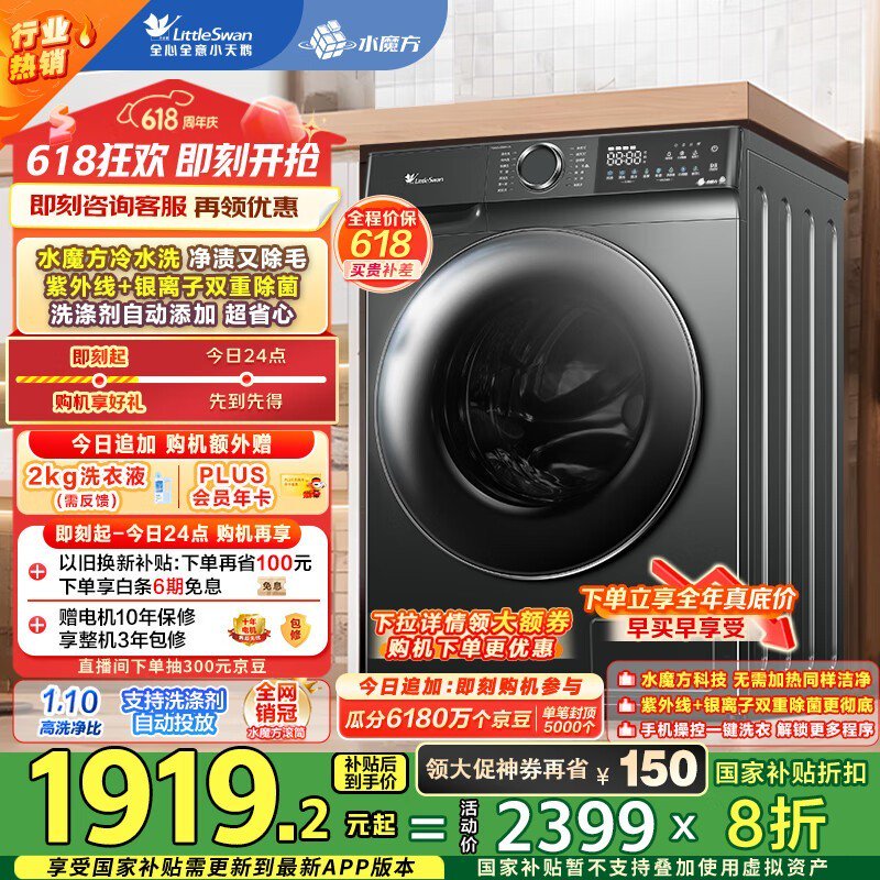 小天鹅水魔方滚筒洗衣机10kg大容量促销