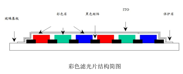 目前LCD显示器中TFT-LCD(即薄膜晶体管液晶显示器)是市场的主流,TFT-LCD面板的构造可简单视为两片玻璃基板中间夹着一层液晶,上层的玻璃基板是与彩色滤光片(colorfilter)结合,而下层的玻璃则有晶体管镶嵌于上。当电流通过晶体管时产生电场变化,造成液晶分子偏转,改变光线的偏极性,在电场的作用下,液晶分子排列方向发生变化,使得外光源透光率改变(调制),再利用红、绿、蓝三基色信号的不同机理,通过红、绿、蓝三基色滤光膜,完成时域和空间域的彩色重显。在LCD显示器的加工过程中,光刻胶主要用于制作显示器像素、电极、障壁、荧光粉点阵等。
