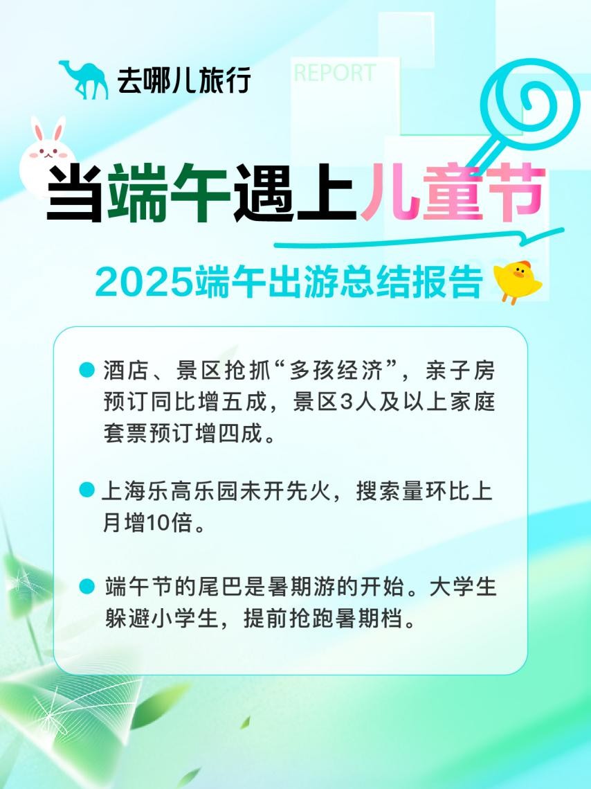 今年端午恰逢六一儿童节,双节叠加拉动亲子游火热。去哪儿旅行大数据显示,主题乐园景区在这个端午小长假最受欢迎,预订量同比增六成。