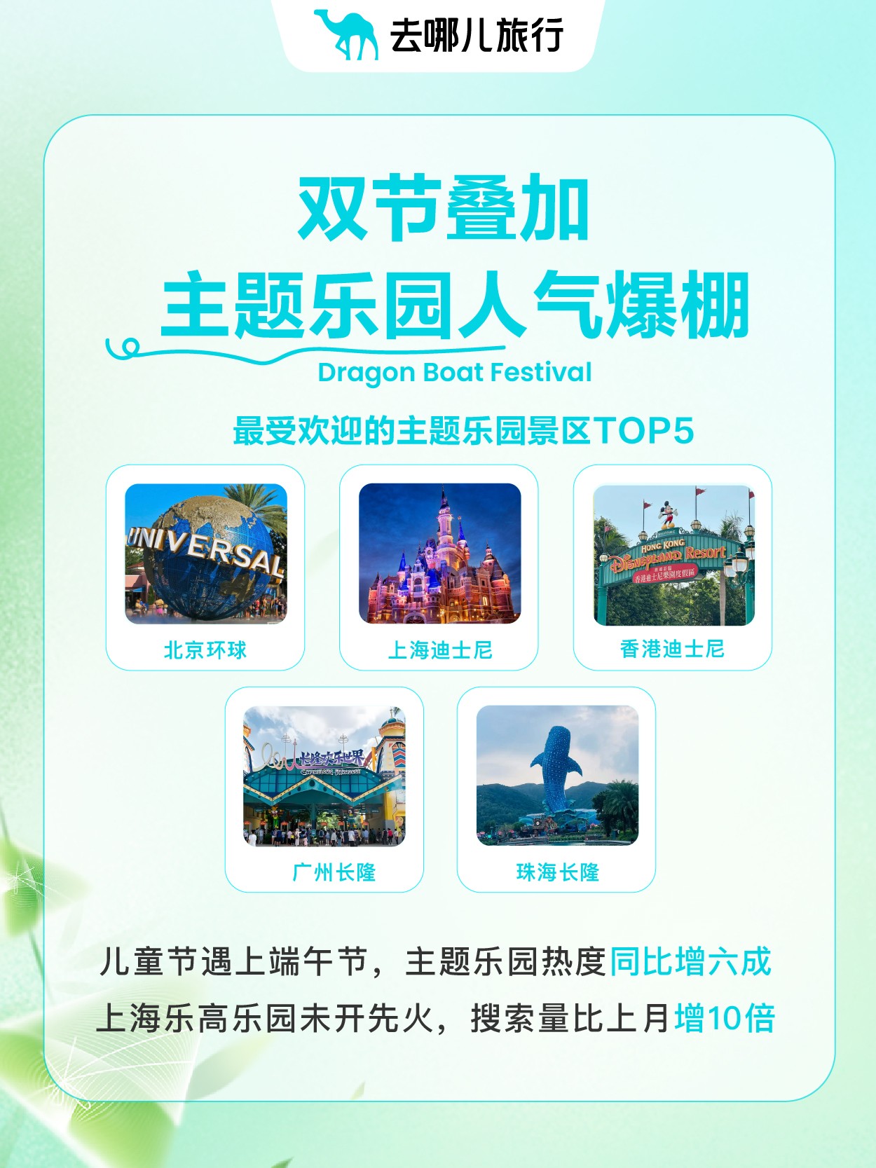 截至6月2日,去哪儿平台上,端午最受欢迎的主题乐园景区包括北京环球度假区、上海迪士尼度假区、香港迪士尼乐园、广州长隆野生动物世界和珠海长隆海洋王国。