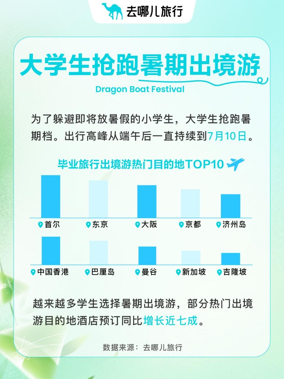 端午节的尾巴是暑期游的开始。大学生躲避小学生,提前抢跑暑期档,他们的出行高峰从端午后持续到7月10日左右。毕业旅行已在路上,尤其是暑期出境游预订已明显增多,热门出境游城市酒店预订同比增近七成。
