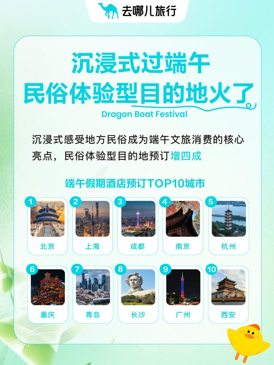 去龙舟文化发源地湖南汨罗,参与江灯祈福、包牛角粽,感受屈原故里的文化厚重感;贵州镇远古镇的苗侗龙舟赛结束后,“抢鸭子”活动让游客在欢笑声中体验传统趣味;在广东佛山,看龙舟竞渡、体验划龙舟、游龙集市等活动沉浸式带旅客感受传统文化魅力……去哪儿平台上,拥有丰富民俗体验的湖南岳阳、江苏无锡、广东佛山等目的地,端午酒店预订量同比增长超四成。