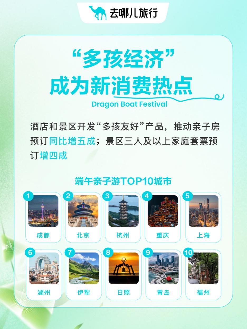 多孩出行是本次假期出行的一大特点。去哪儿平台上,端午期间,亲子房预订同比增超五成,景区3人及以上家庭套票预订增四成。 从亲子房预订情况看,截至6月2日,端午亲子游热门Top10城市为成都、北京、杭州、重庆、上海、湖州、伊犁、日照、青岛和福州。