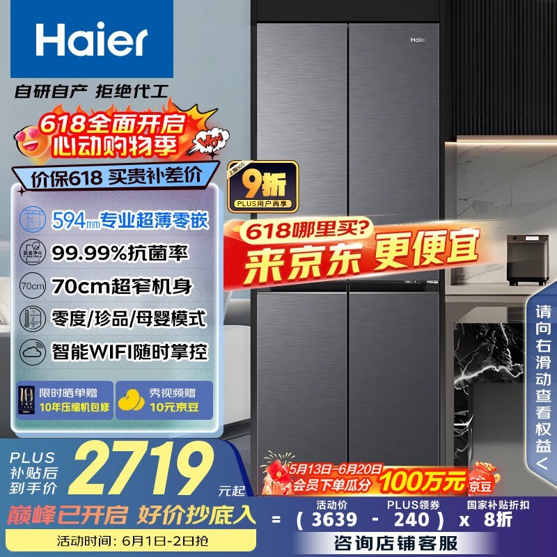 海尔418L风冷十字冰箱星蕴银智能保鲜京东特惠