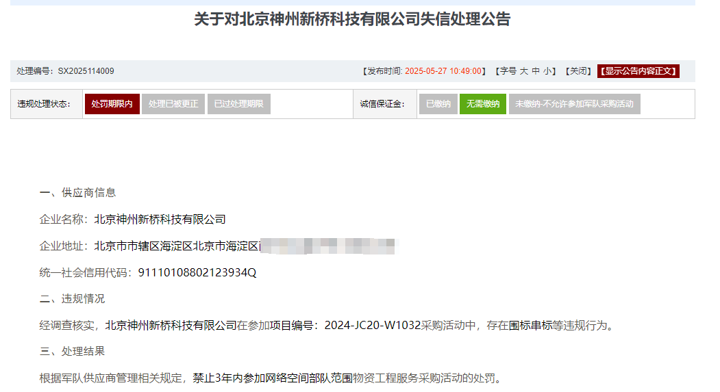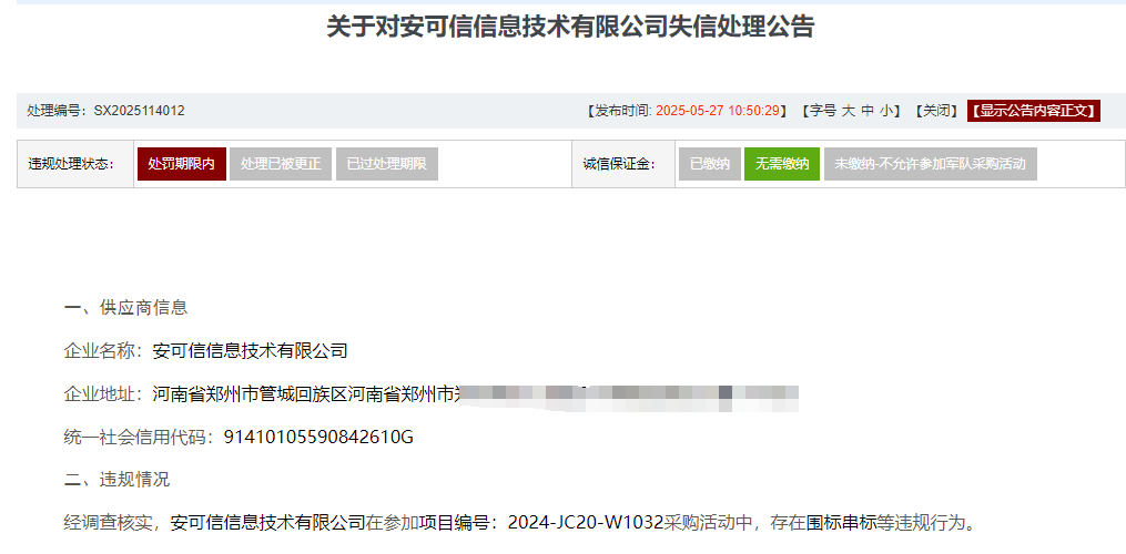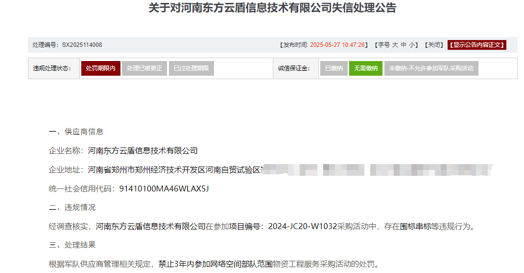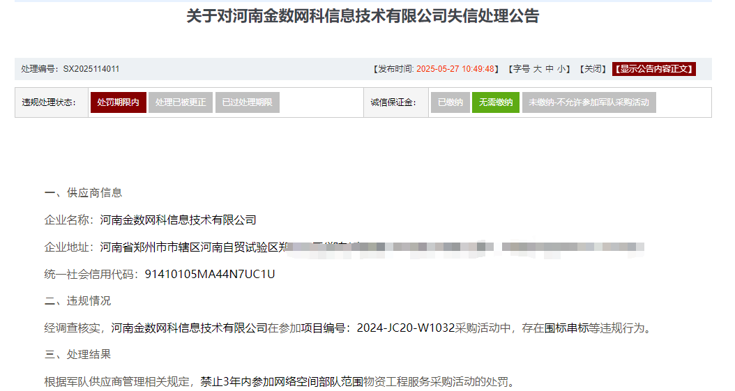 公告显示,安可信信息技术有限公司、河南金数网科信息技术有限公司、北京神州新桥科技有限公司、河南东方云盾信息技术有限公司均因在参加项目编号为2024-JC20-W1032的采购活动中,存在围标串标等违规行为,被禁止3年内参加一定范围物资工程服务采购活动,处理时间自2025年05月27日起算。