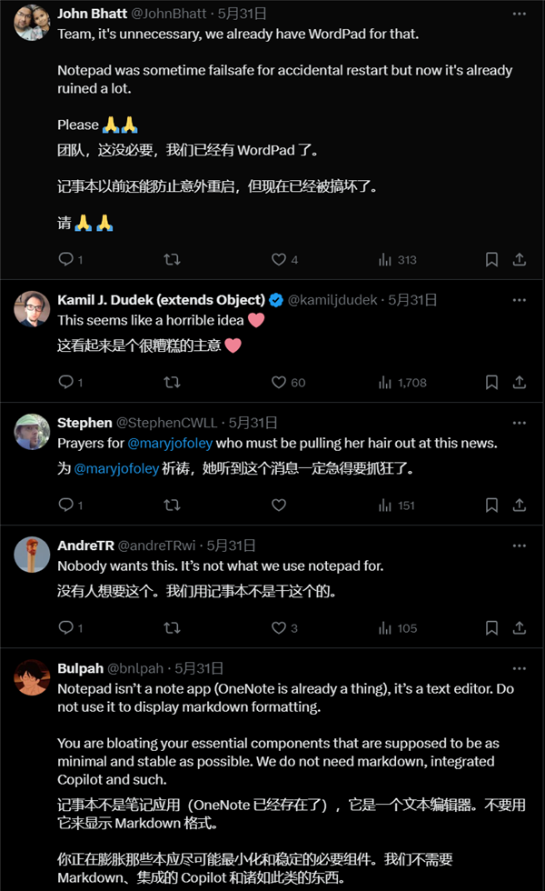 一位用户在X平台上发帖称:“团队,这是不必要的,我们已经有写字板了。记事本曾是一个防止意外重启的安全选择,但现在它已经被破坏了很多。”