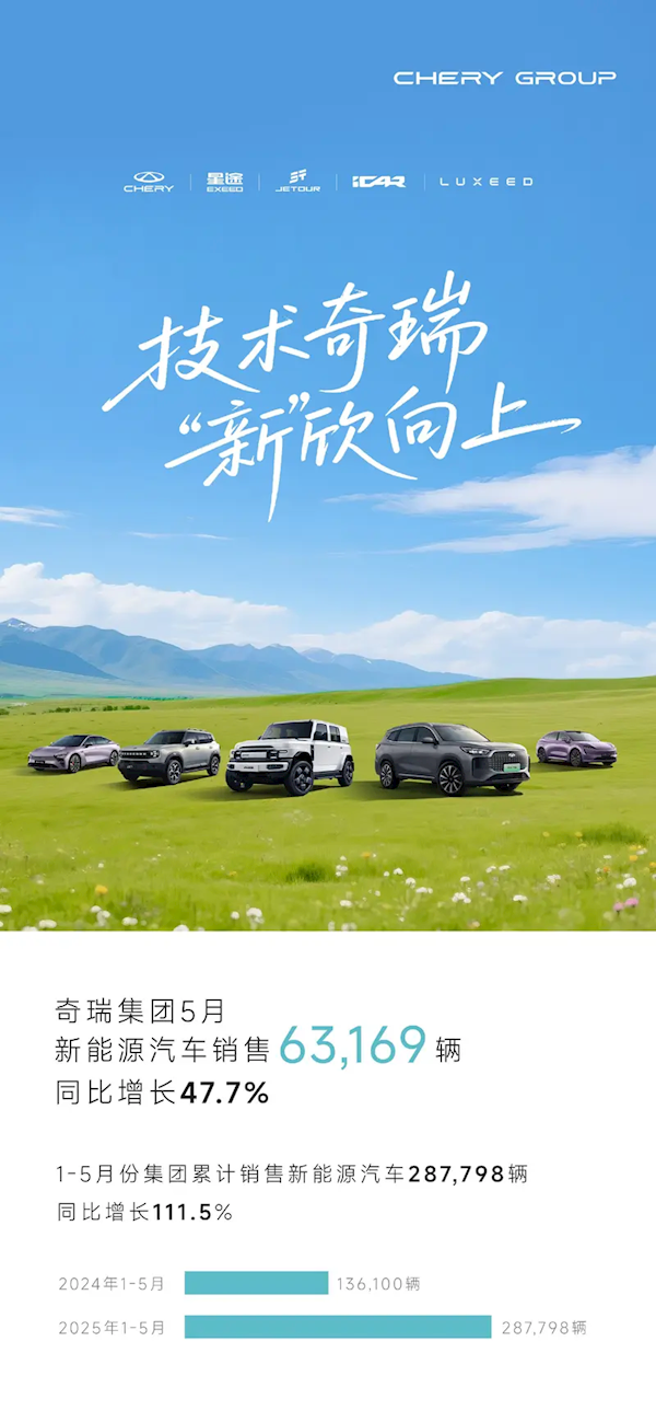 这一成绩不仅展现了奇瑞集团在市场中的稳健发展,也为其未来的发展奠定了坚实基础。特别是在新能源领域,1-5月累计销量达到287798辆,同比增长111.5%。