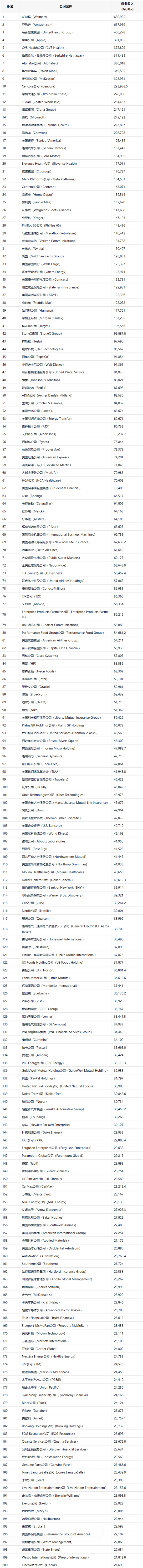 今年,沃尔玛凭借其营业收入连续第十三年位列榜首,亚马逊连续六年位列第二,联合健康集团超越苹果公司,位列第三。