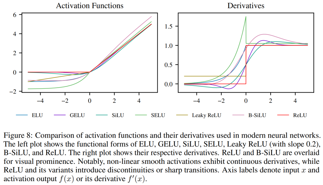 图 8 中可视化了 B-SiLU 及其导数。NeLU:本文进一步引入了 NeLU(Negative slope Linear Unit),作为 ReLU 的平滑导数替代品。