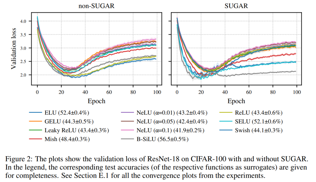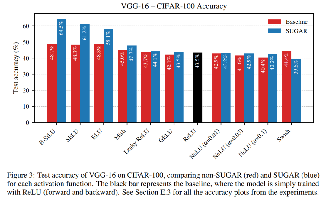 在 CIFAR-100 数据集上,SUGAR 结合 B-SiLU 的优势更加明显:ResNet-18 的准确率从 48.99% 跃升至 56.51%,VGG-16 的准确率从 48.73% 提升至 64.47%(见图 3)。同样,Leaky ReLU 和 NeLU 仅显示出微小的甚至是负的提升(例如 ResNet-18 上的 43.67% → 43.41%)。