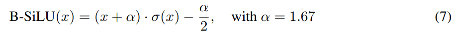 B-SiLU:引入了一种名为 B-SiLU(Bounded Sigmoid Linear Unit) 的新型激活函数,它结合了自门控特性和可调下限参数。从数学上讲,该函数可以表示为: