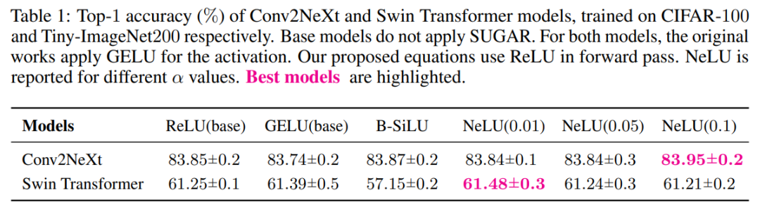 当应用于 Conv2NeXt 时,如表 1 所示,SUGAR 在前向和反向传播过程中均始终优于使用 GELU 的基础模型。