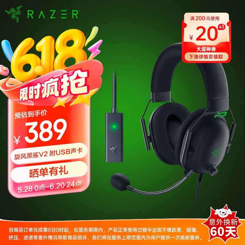 雷蛇旋风黑鲨V2耳机京东促销,到手286元