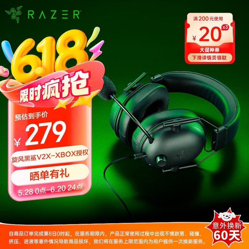 雷蛇旋风黑鲨V2 X头戴式游戏耳机限时特惠