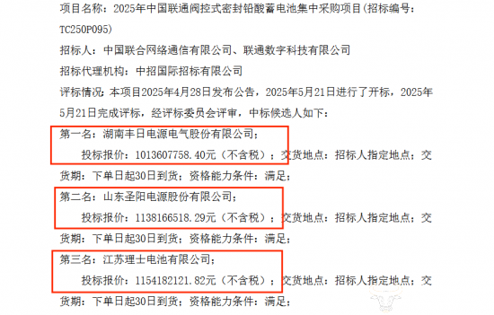 5月26日公示的中标候选人名单显示,本次共有三家厂商入围中标候选人名单。其中,湖南丰日电源电气股份有限公司凭借1013607758.4元(不含税)斩获第一名;山东圣阳电源股份有限公司凭借1138166518.29元(不含税)位列第二;江苏理士电池有限公司投标报价为1154182121.82元(不含税),排名第三。