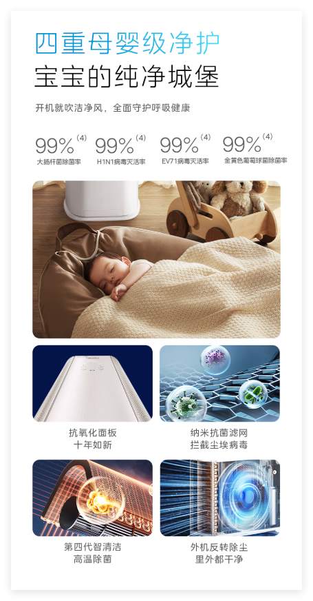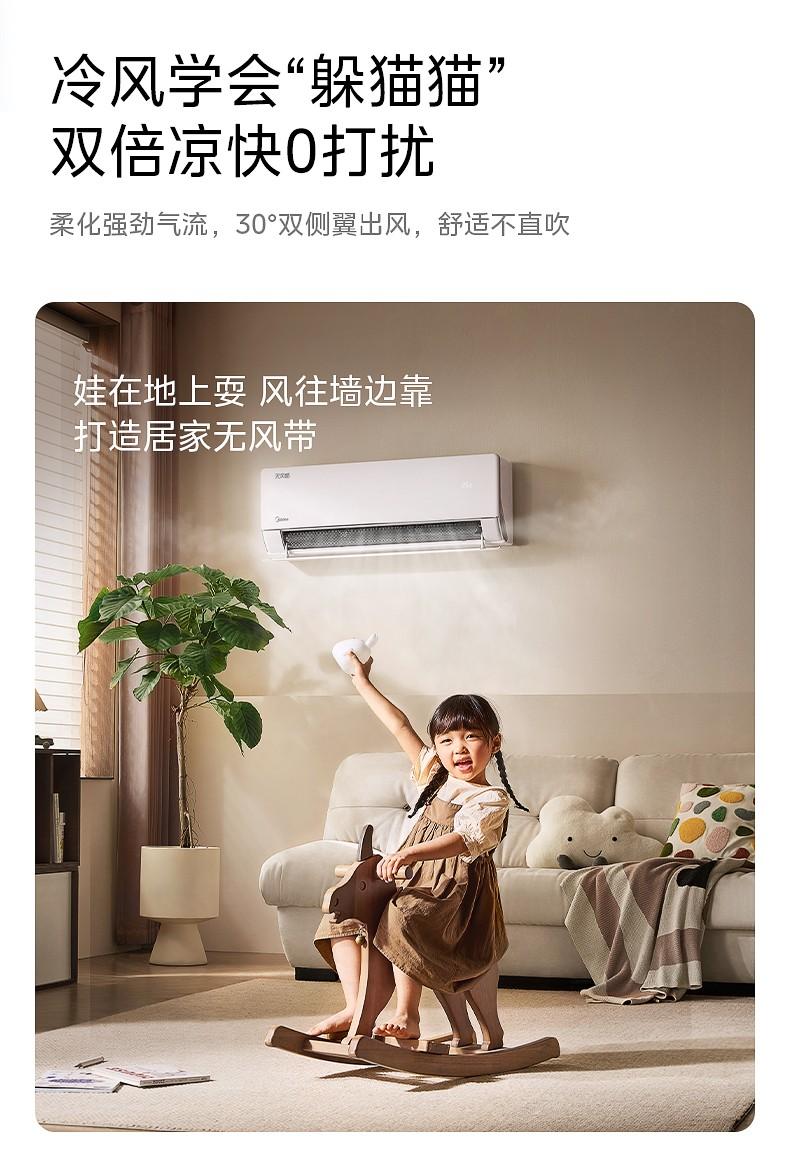 除了独有的无风感黑科技,美的无风感空调·云朵系列还搭载了独立研发的一键母婴模式,其基于母婴用户大数据,打造出了更适合母婴体质的温湿风黄金配比,该模式下,空调可自动将室内的温度调至26℃、湿度调至30%-70%、风速调至0.3m/s人体最舒适的状态,让家中的空气始终保持在稳定舒爽的状态,既避免了忽冷忽热,还使空不闷不湿不干不燥,给予用户母婴级的呵护。在此基础上,美的无风感空调·云朵系列还搭载了四重母婴级净护功能,层层呵护内外机的洁净,确保空调开机就吹干净风,更有酷省电模式,一键开启,空调可动态预测室内温度变化,实时温度牵引,实现了舒适与省电的双提升。