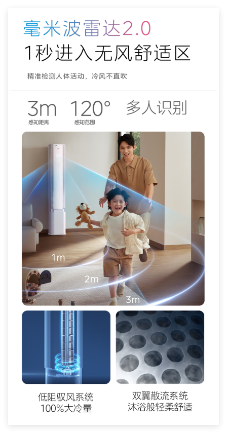 美的无风感空调·云朵系列柜机则更是升级了AI无风感,通过AI技术的加持,可以实现主动防冷风,引领舒适空调进入“主动思考”的时代。其内置毫米波雷达2.0系统,可精准监测空调前方3米120°区域内的人体活动,一旦感应到目标,空调便会主动开启左、右无风感或全无风感模式,因人而异提供差异化送风方案。冷风主动避让,孕妈、宝妈、小孩、老人都能放心呆在空调房。值得一提的是,美的无风感空调·云朵系列柜机还搭载了双风道环流系统,左右双风口可同时分配冷量,清爽无盲区,仅需3分钟凉意就能覆盖整个客餐厅,如在高速上行驶般快速。更有独立自研的15维精准控风系统,用户可根据实际需求自由组合成125种风感组合,营造出“一个空间,两个世界”的奇妙体验。