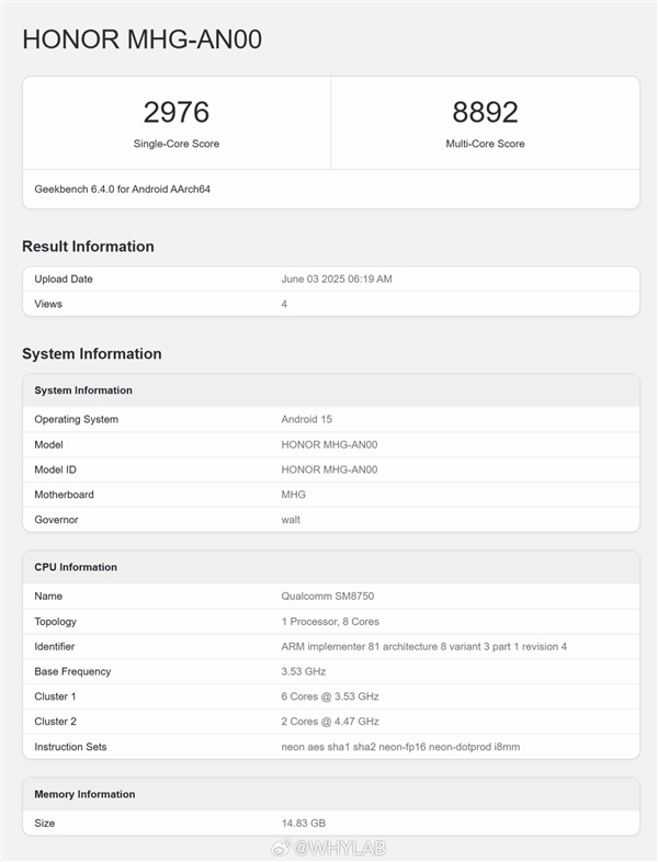 目前该机的跑分已经出现在Geekbench 6数据库型号MHG-AN00,搭载高通骁龙8至尊领先版,成绩是单核2976分,多核8892分。
