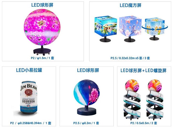 球形屏360度全方位显示,适用于科普娱乐场景;螺旋屏与球形屏联动,动态画面震撼吸睛;小易拉罐屏小巧易拼接,小立方屏多角度显示,为创意展示、商业活动注入趣味活力。