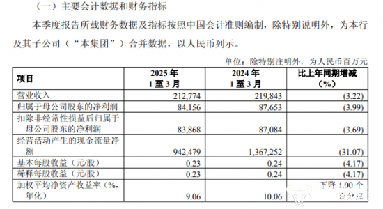 除上述人事变动外,工行公布的2025年第一季度报告同样值得关注。据其一季度报告显示,该行在2025年前三个月实现营业收入约为2127.74亿元,同比下降3.22%;归属于母公司股东的净利润为841.56亿元,同比下降3.99%。