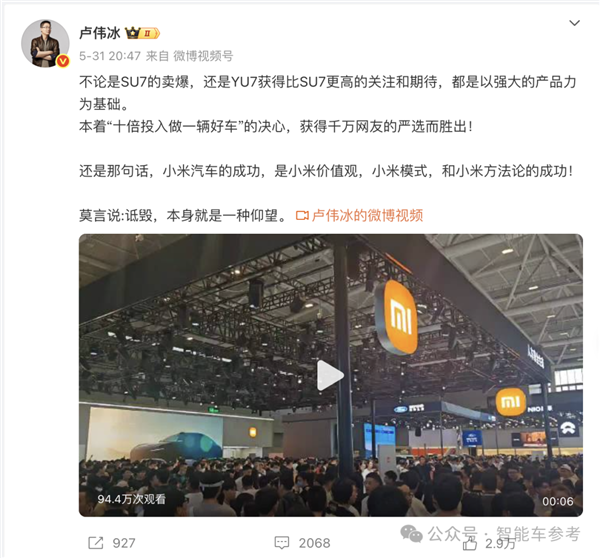 卢伟冰先手开团,从大湾区车展的热闹场面切入,解释了小米造车成功之元,最后结尾用了一句不知道在哪儿看的莫言名句:诋毁,本身就是一种仰望。