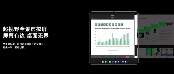 资料显示,超视野全景虚拟屏是Find N3首发的折叠屏内屏多应用交互方式,和传统的、以屏幕物理尺寸为边界的交互设计不同,超视野全景虚拟屏就像它名字一样,让不同尺寸、不同大小的应用窗口,超越屏幕视野限制、自由排列。