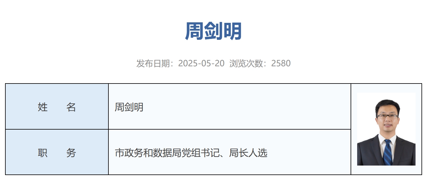 C114讯 6月4日消息 深圳市政务服务和数据管理局官网近日更新机构领导信息,显示原深圳联通总经理周剑明已为该局党组书记、局长人选。