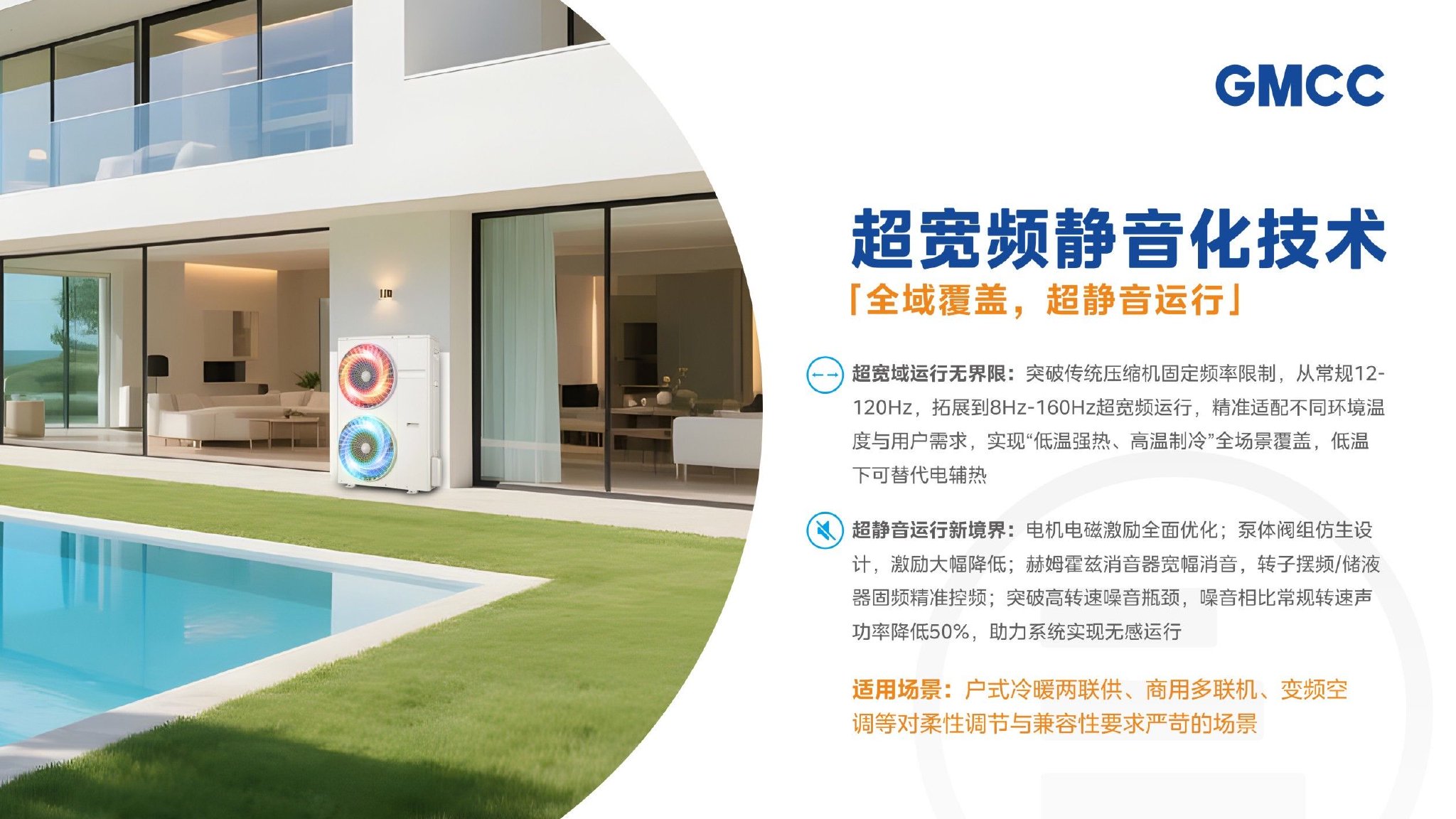 除提升能效外,为进一步改善热泵产品的使用舒适性、节能性,延长使用寿命以及使用灵活性,美芝通过突破传统压缩机常规12-120Hz的固定频率限制,以超宽频静音化技术实现了“全域覆盖,超静音运行”,将热泵产品的使用体验提升到了新高度。