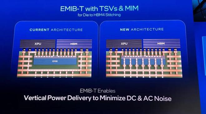 EMIB-T可提升关键的封装供电效率指标,并加快了芯片间通信速度。标准EMIB连接由于采用悬臂式供电路径而存在高电压降问题,而EMIB-T利用硅通孔(TSV) 从芯片封装底部通过TSV桥接芯片进行供电,从而实现了直接、低电阻的供电路径,这对于HBM4/4E集成至关重要。与此同时,TSV还提升了芯片间的通信带宽,使用UCIe-A 互连技术,将数据传输速率提升至32 Gb/s或更高。