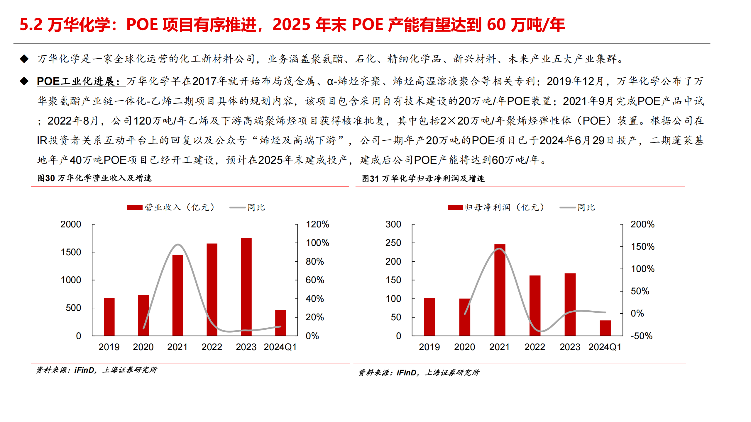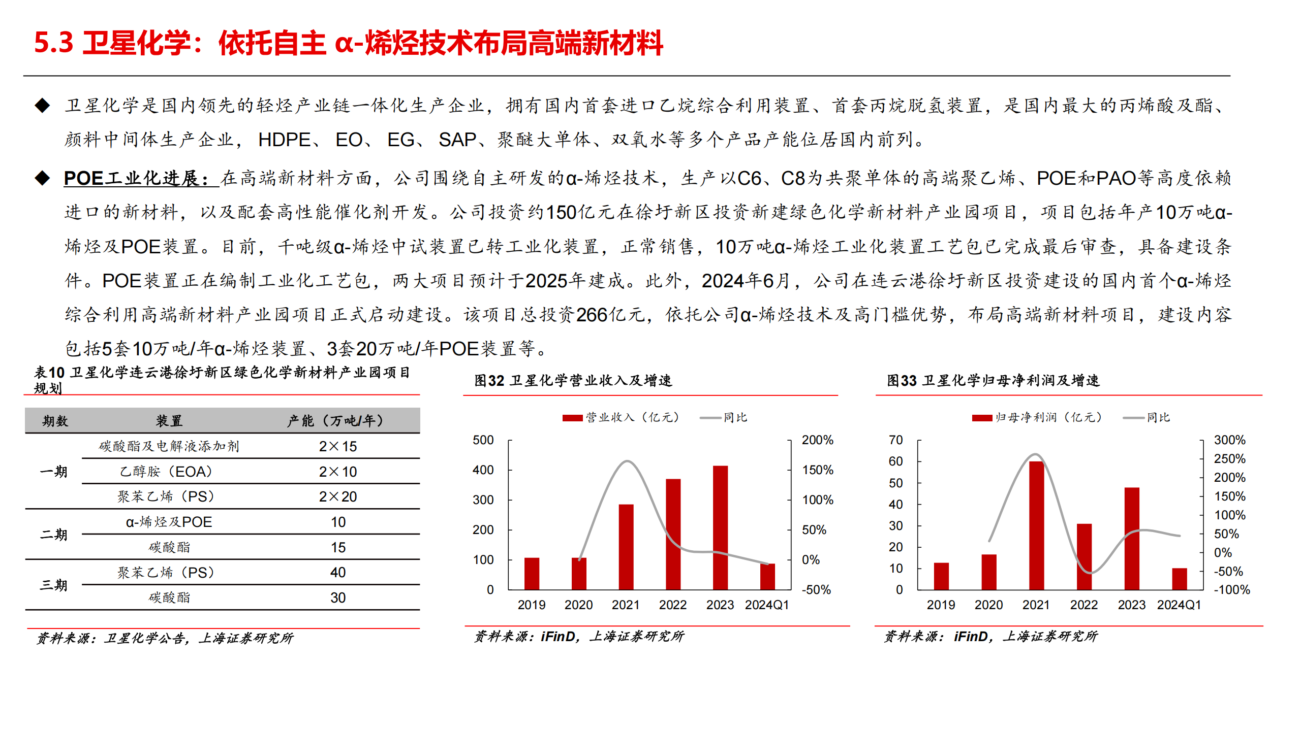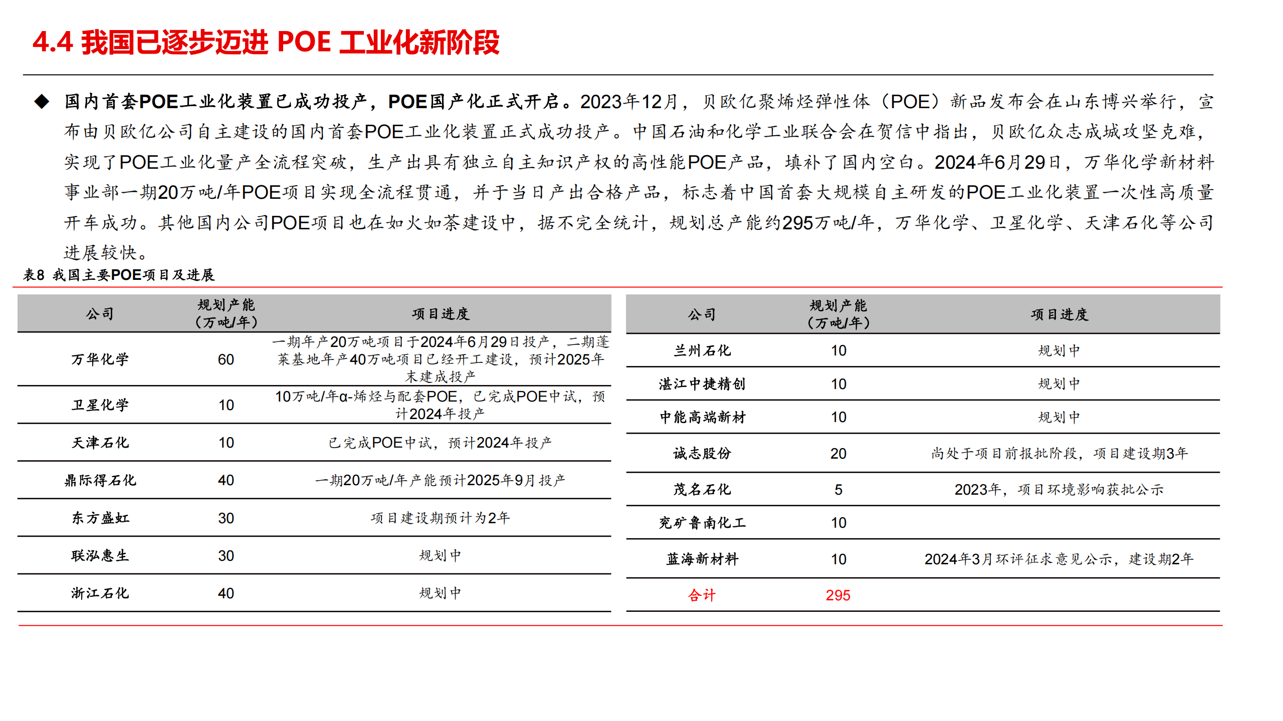 星传新材拥有全球领先的聚烯烃弹性体合成技术,致力于新型聚烯烃弹性体的研发和产业化,应用覆盖传统的合成橡胶和聚烯烃热塑性弹性体。2024年11月,公司全球首套年产3万吨超支化聚烯烃弹性体(H-POE)工业化装置在浙江龙游开工建设;2024年12月,公司中标陕西榆能能化新材料有限公司环氧树脂一体化项目(一期)10万吨/年聚烯烃弹性体装置工艺包采购项目并于次月正式签约。