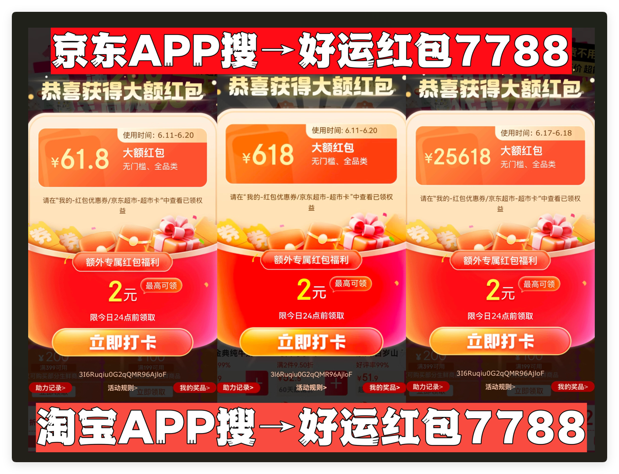 首先,划重点!今年天猫/淘宝和京东的618红包口令都是「好运红包7788」要记住!领的红包大小和你搜索的什么口令有关的!这个双平台通用口令包领到大的!记得每天去领!