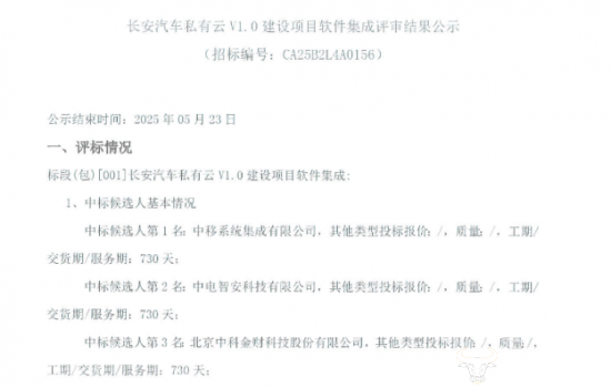 最终,排名第一的中移系统集成有限公司击败中电智安科技有限公司和北京中科金财科技股份有限公司,成为该项目唯一中标人!