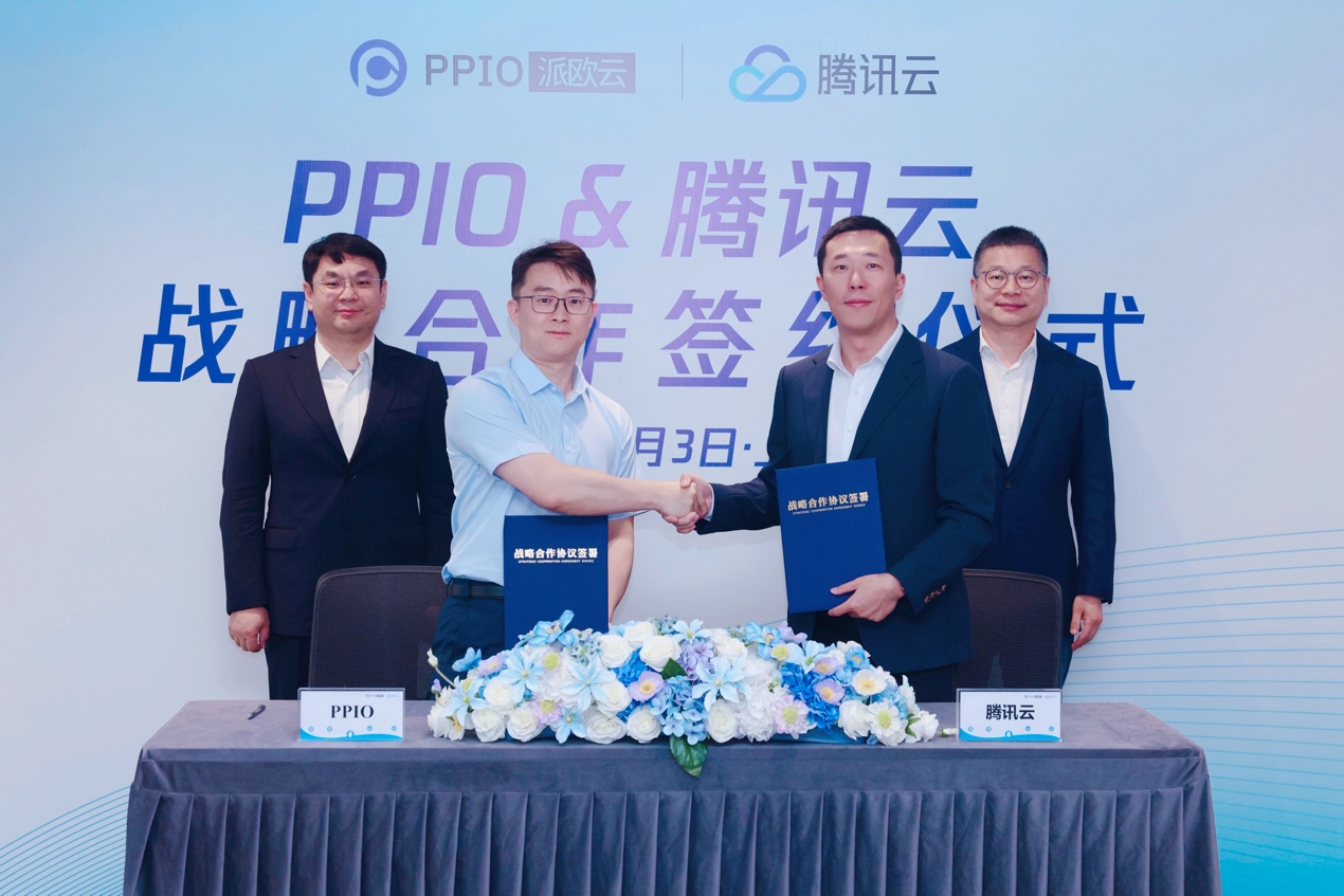 2025年6月3日,PPIO与腾讯云在上海举行战略合作签约仪式,双方将充分发挥各自优势,在AI基础设施、全球化服务以及AI大模型场景拓展等方面开展合作。腾讯云副总裁顾伟、PPIO智算业务研发副总裁李星星代表双方签署战略合作协议,腾讯集团副总裁、政企业务总裁与PPIO联合创始人兼CEO姚欣出席见证。