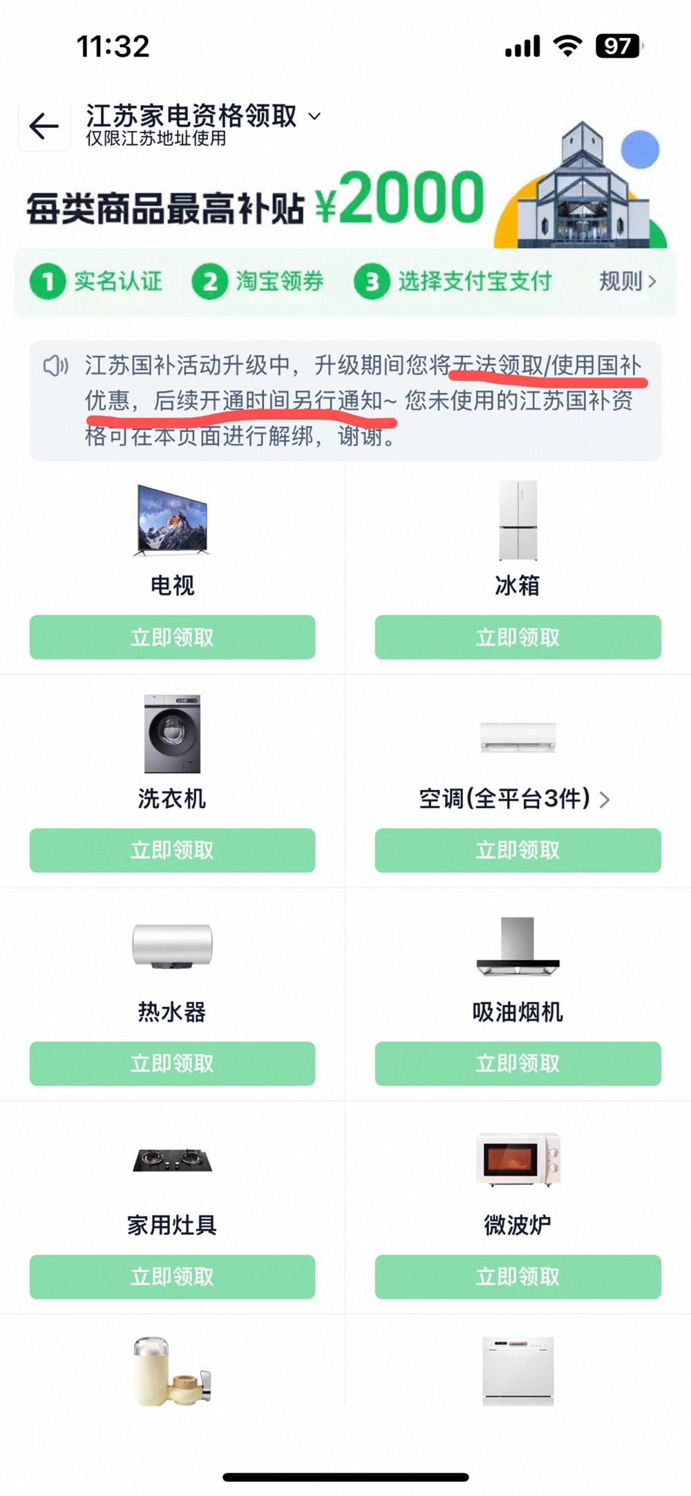 今天笔者在淘宝的江苏国补资格领取页面也发现,无法领取家电和手机数码的补贴。页面提示:“江苏国补活动升级中,升级期间您将无法领取/使用国补优惠,后续开通时间另行通知”