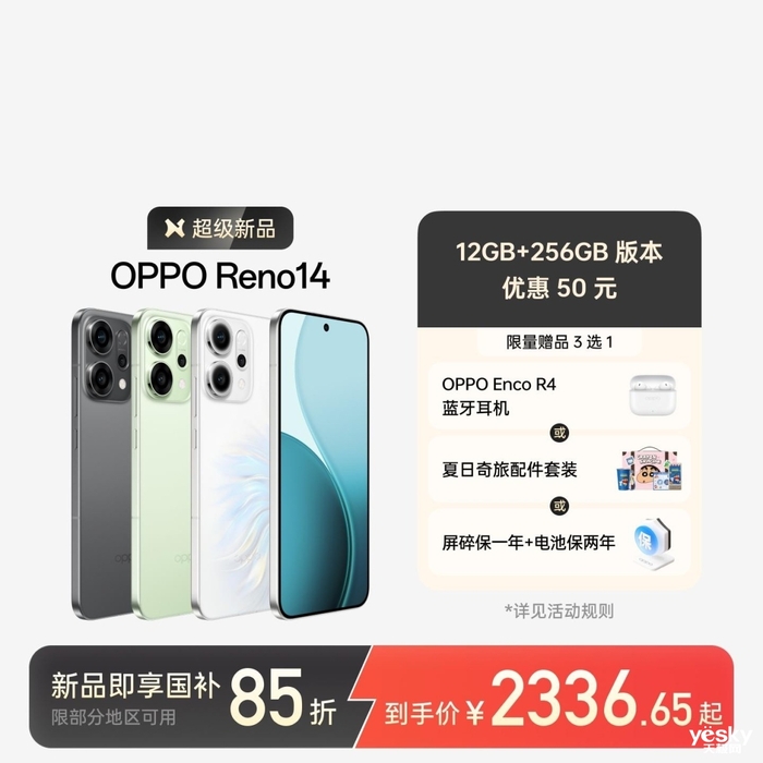 目前在京东平台/OPPO商城,OPPO Reno14系列正在参与618限时特惠,12GB+256GB版本直降至2749元起,在享受国家以旧换新补贴后,最低到手价仅为2336元起!此外,购机还可以在以下礼品中任选一项,包括OPPO新品的蓝牙耳机、全职高手限定礼盒/夏日奇旅配件套装和京东两年碎屏保/碎屏保1年+电池保2年。