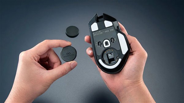 HyperFlux V2的充电模块不再内置在鼠标内部,而是采用了独立模块设计,用户可以通过打开鼠标底部的盖子进行更换。
