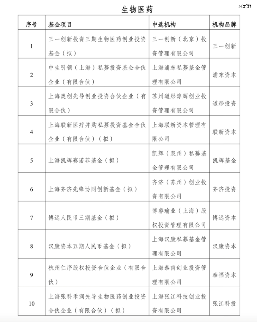 第二批生物医药产业子基金共有10只,子基金管理人包括浦东资本、道彤投资、联新资本、凯辉基金、博远资本、张江科投以及泰福资本旗下注册在杭州的杭州仁序股权投资合伙企业(有限合伙)等。