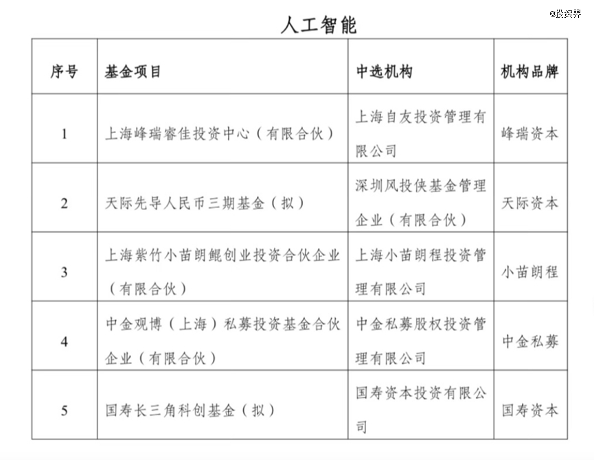 还有人工智能母基金,第二批共遴选5只子基金,管理人包括峰瑞资本、天际资本、小苗朗程、中金私募和国寿资本。