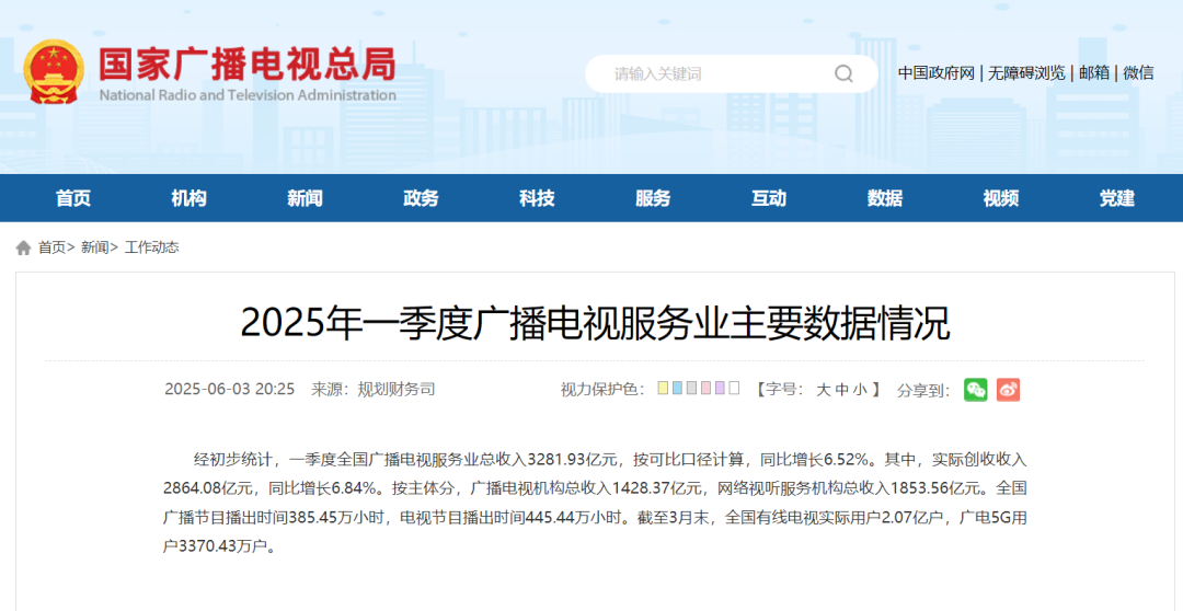 6月3日,国家广播电视总局发布2025年一季度广播电视服务业主要数据情况。经初步统计,一季度全国广播电视服务业总收入3281.93亿元,按可比口径计算,同比增长6.52%。其中,实际创收收入2864.08亿元,同比增长6.84%。按主体分,广播电视机构总收入1428.37亿元,网络视听服务机构总收入1853.56亿元。全国广播节目播出时间385.45万小时,电视节目播出时间445.44万小时。