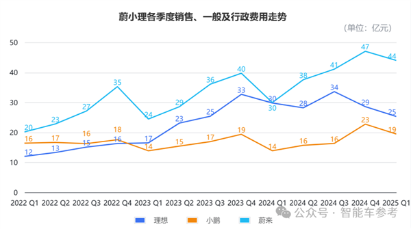 而且过去三年,蔚来销管费用呈现出了更明显的增长趋势,累计支出434亿元,理想和小鹏则分别支出300亿元和221亿元。