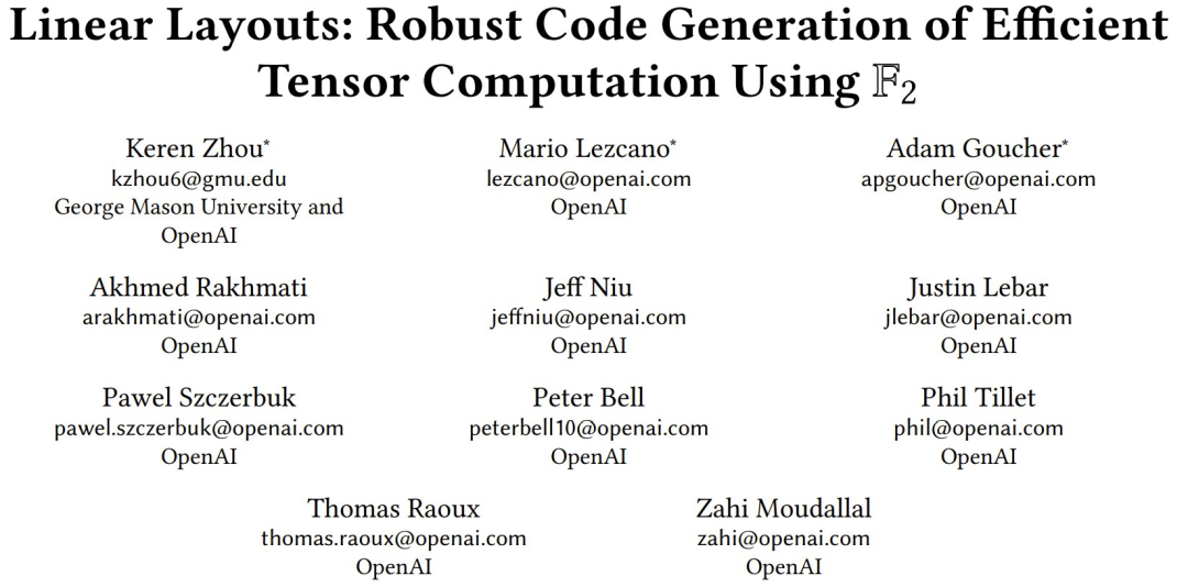 不过近日,OpenAI 也确实发布了一份完全由自己人参与的、实打实的研究论文,其中提出了一种用于高效张量映射的统一代数框架 Linear Layouts。这是一种使用二元线性代数而非比特表示(bit representation)的张量布局的通用代数形式,解决了 Triton 等深度学习编译器中长期存在的难题。