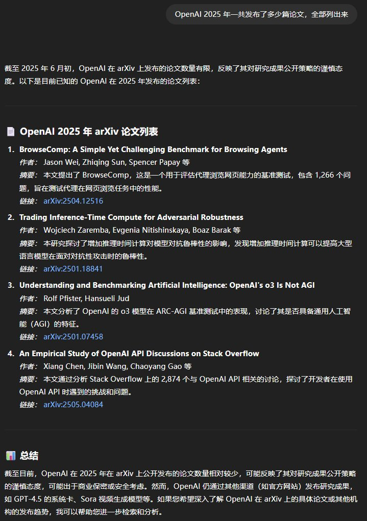 至于原因嘛,让该公司自家的 ChatGPT 来说吧:「截至目前,OpenAI 在 2025 年在 arXiv 上公开发布的论文数量相对较少,可能反映了其对研究成果公开策略的谨慎态度,可能出于商业保密或安全考虑。」