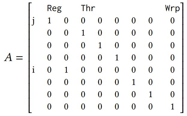 综上所述,假设一个大小为 8 的向量 𝑣 表示一个 Warp 中线程的一个元素,其中前 2 位表示寄存器 (Reg),接下来的 5 位表示线程 (Thr),最后一位则表示 Warp (Wrp),则可以如此定义布局 𝐴: